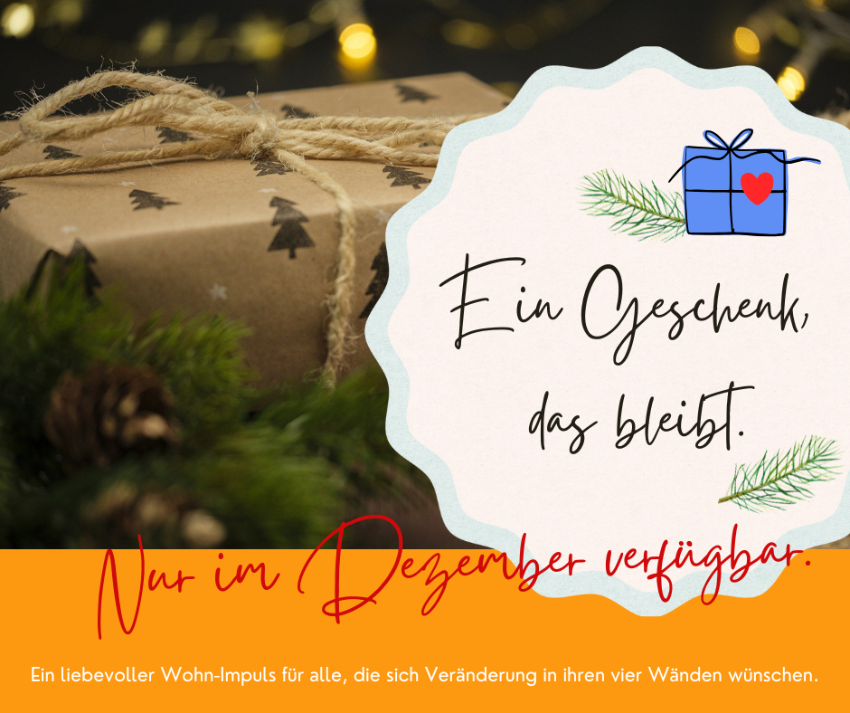 Dein Herzensmensch (oder du selbst) bekommt gleich zum Start ins neue Jahr einen frischen Wohn-Impuls, der den ersten Funken zündet: ein kleiner, feiner Blick von mir auf den entsprechenden Raum – sowie einen Eindruck davon, wie viel Veränderung möglich wäre. Dein Geschenk, schenkt sozusagen die Erlaubnis endlich anzufangen.✨